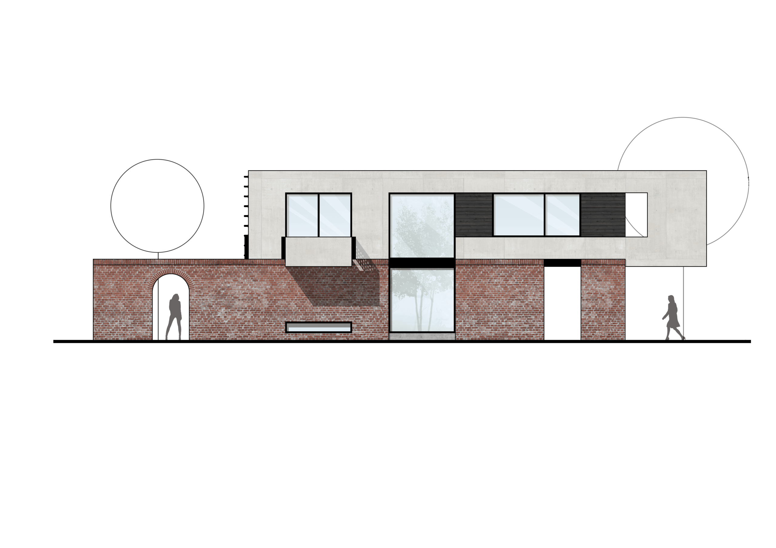 exposed concrete upper volume. Featuring floor-to-ceiling glazing and