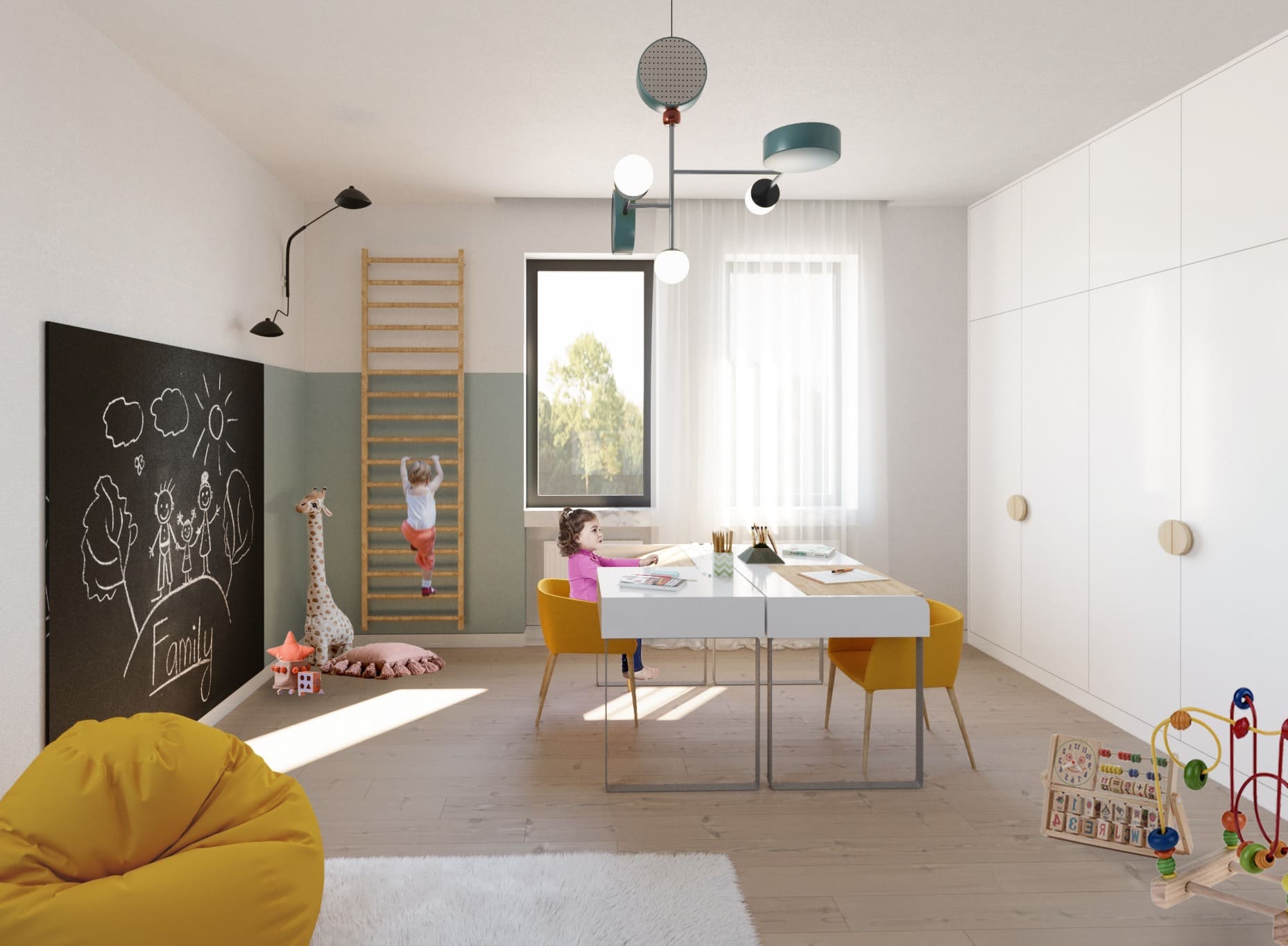 chalkboard surfaces for drawing, and bright, happy colors, these spaces